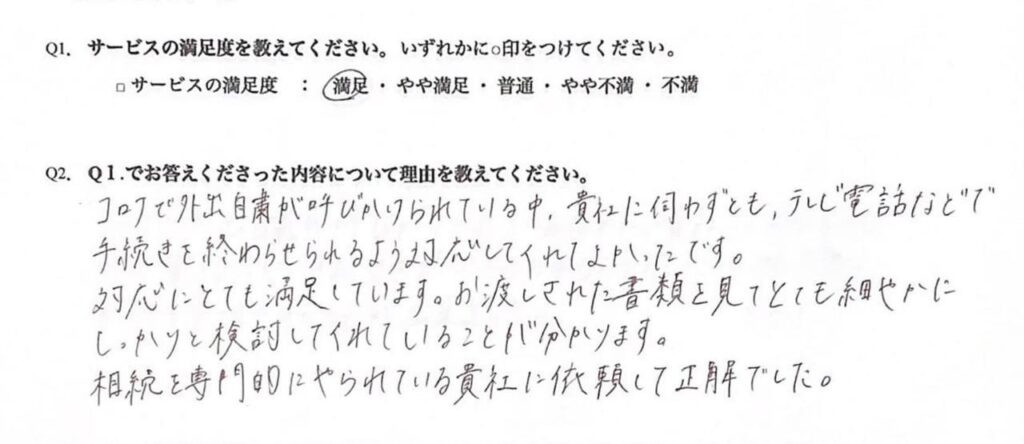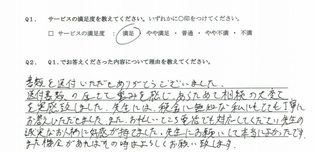 「相続を専門的にやられている貴社に依頼して正解でした。お渡しされた書類を見てとても細やかにしっかりと検討してくれていることが分かります。」