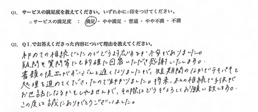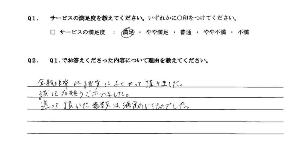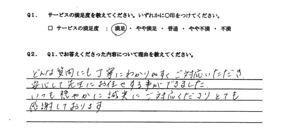 当事務所にご依頼いただいたお客様からのお声をご紹介します。アンケートでは多くの方から「満足」とのご評価をいただいております。