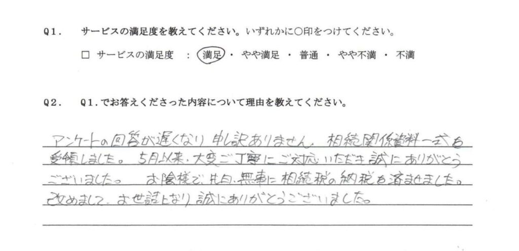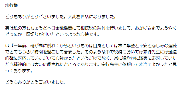 ございました。お陰様で、先日、無事に相続税の納税を済ませてきました。