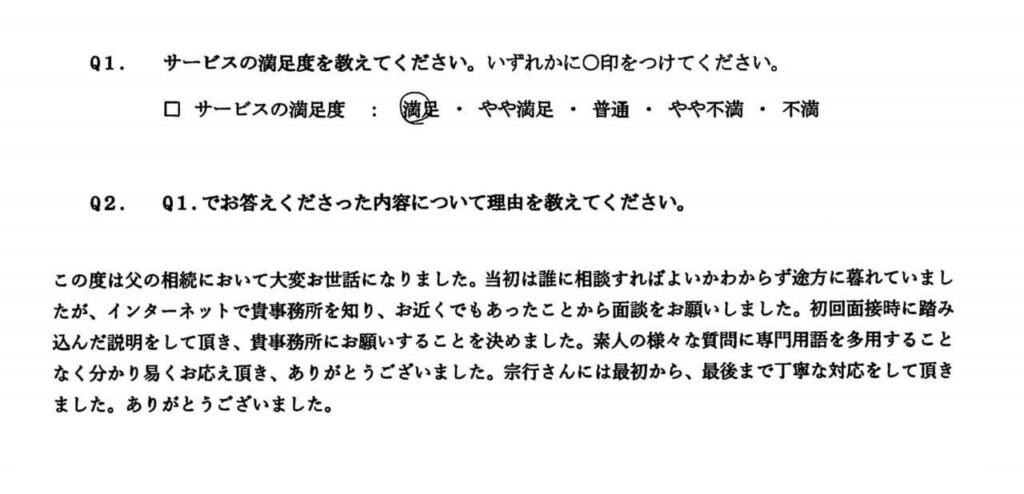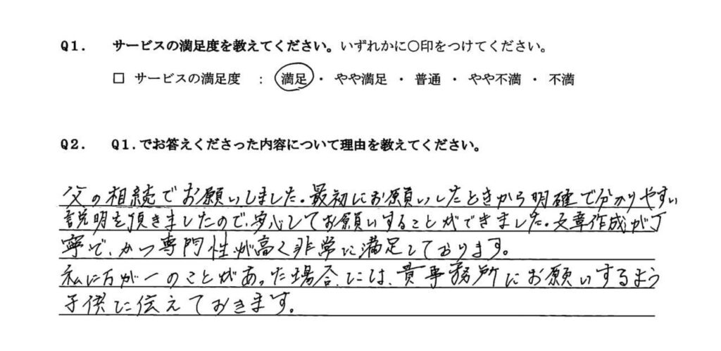 この度は父の相続において大変お世話になりました。当初は誰に相談すればよいかわからず途方に暮れていまし