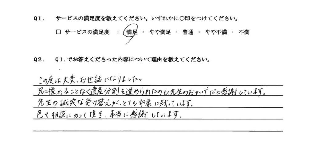 兄と揉めることなく遺産分割を進められたのも先生のおかげだと感謝しています。